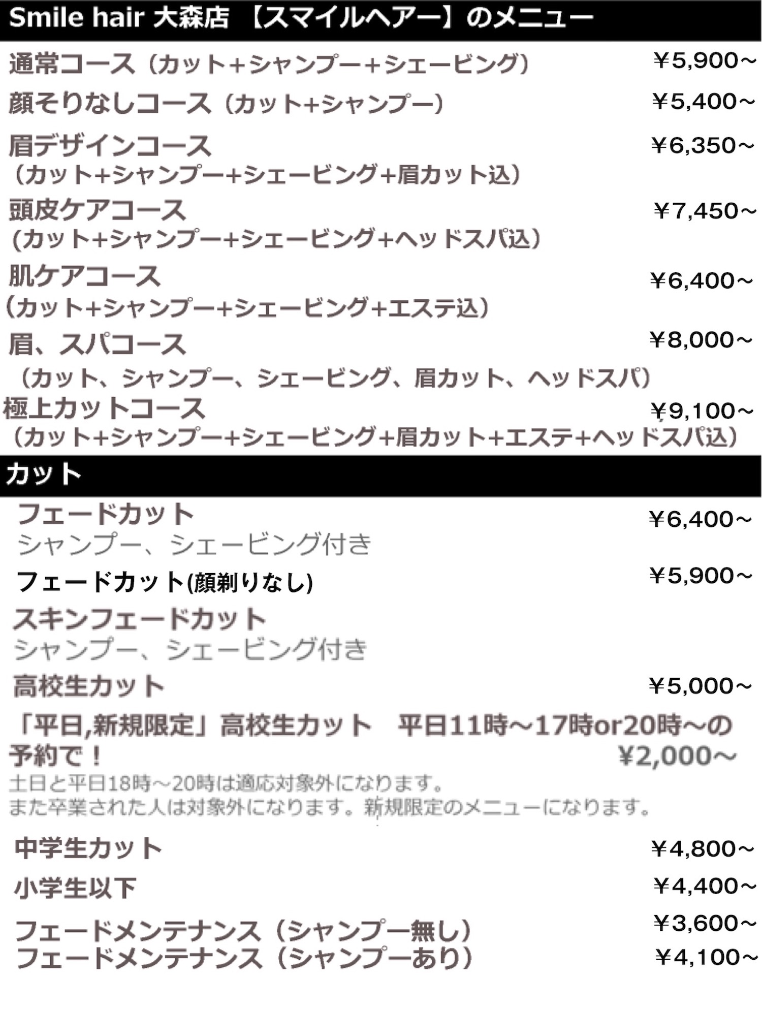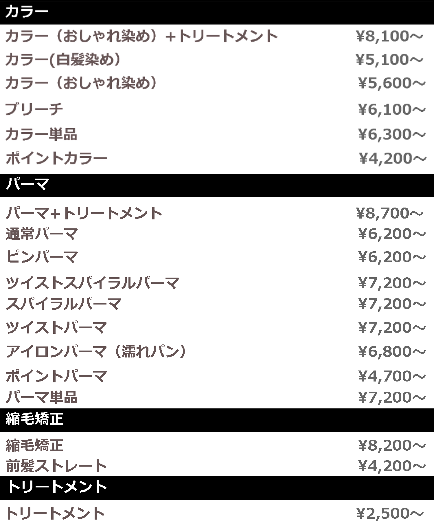 ※カラー、パーマ等の特殊メニューはデザインや長さにより時間がかかる場合は+料金が掛かります。 ※繁忙期には+500円の別途料金が掛かります。 (初回と1ヶ月半以内に再来店してる方は掛かりません。)